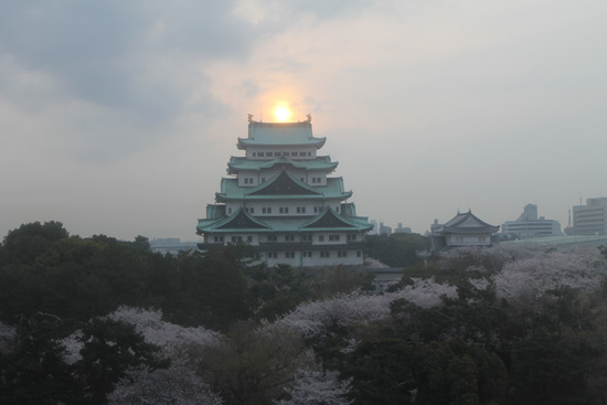 The view from my hotel room of the sun rising behind Nagoya Castle.