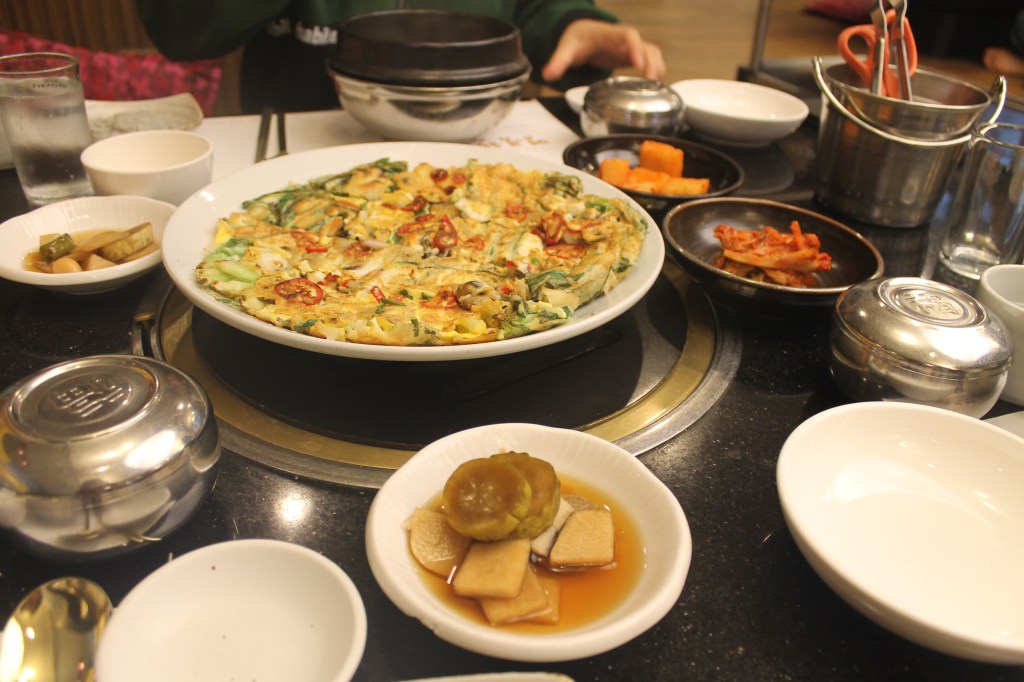 CJ guided us into a cozy restaurant, where we sat on a table low to the ground and feasted on seolleontang — a milky beef bone soup — and kimchi pancakes, a perfect meal for this rainy day.