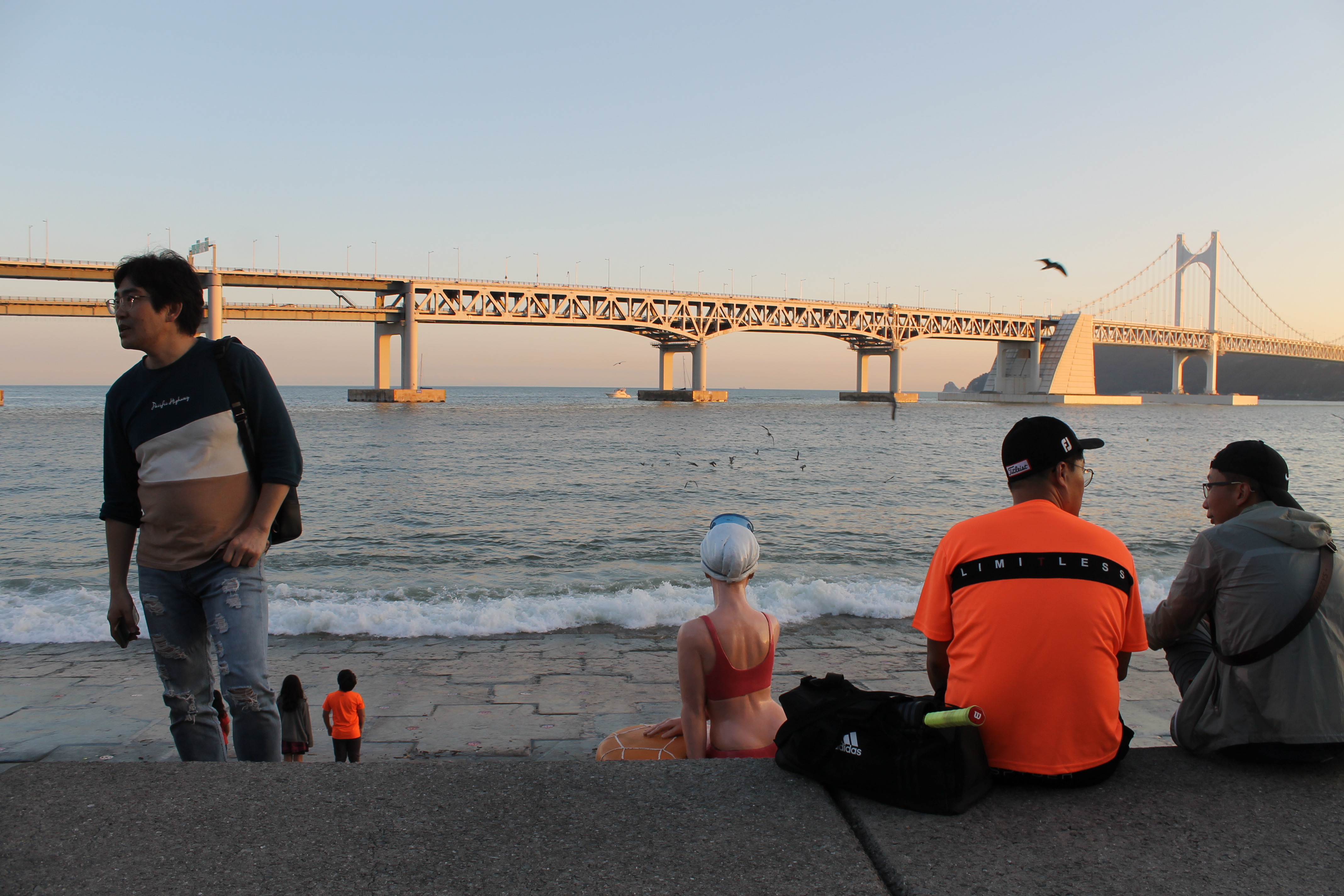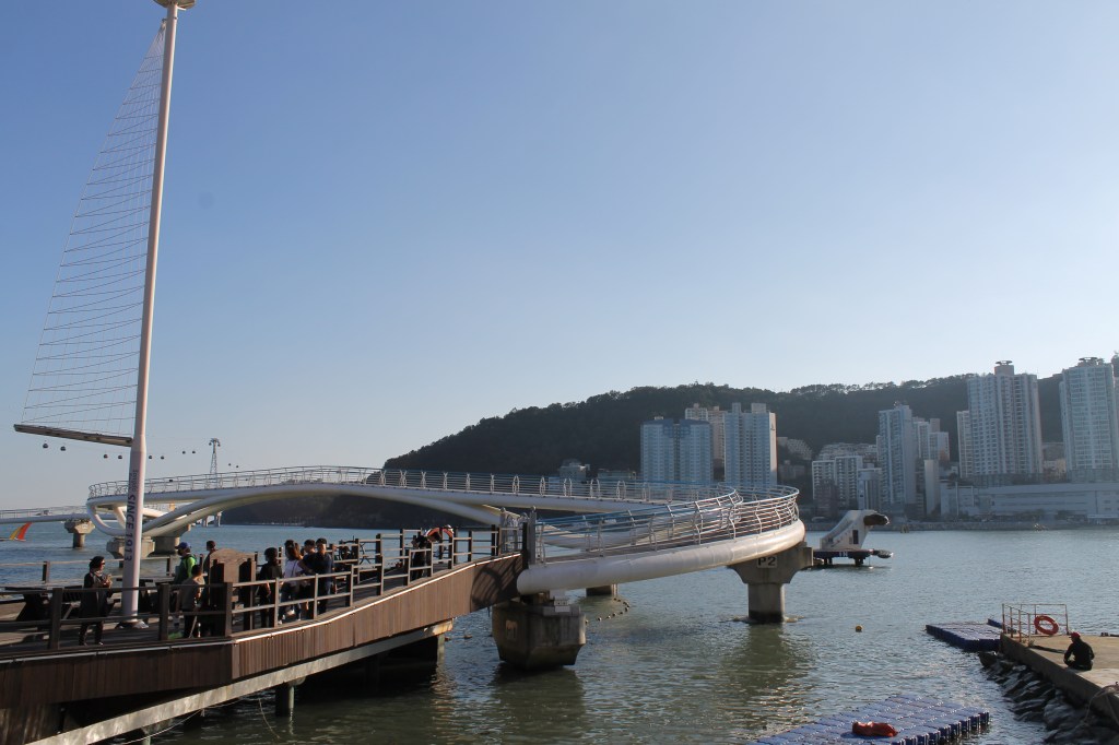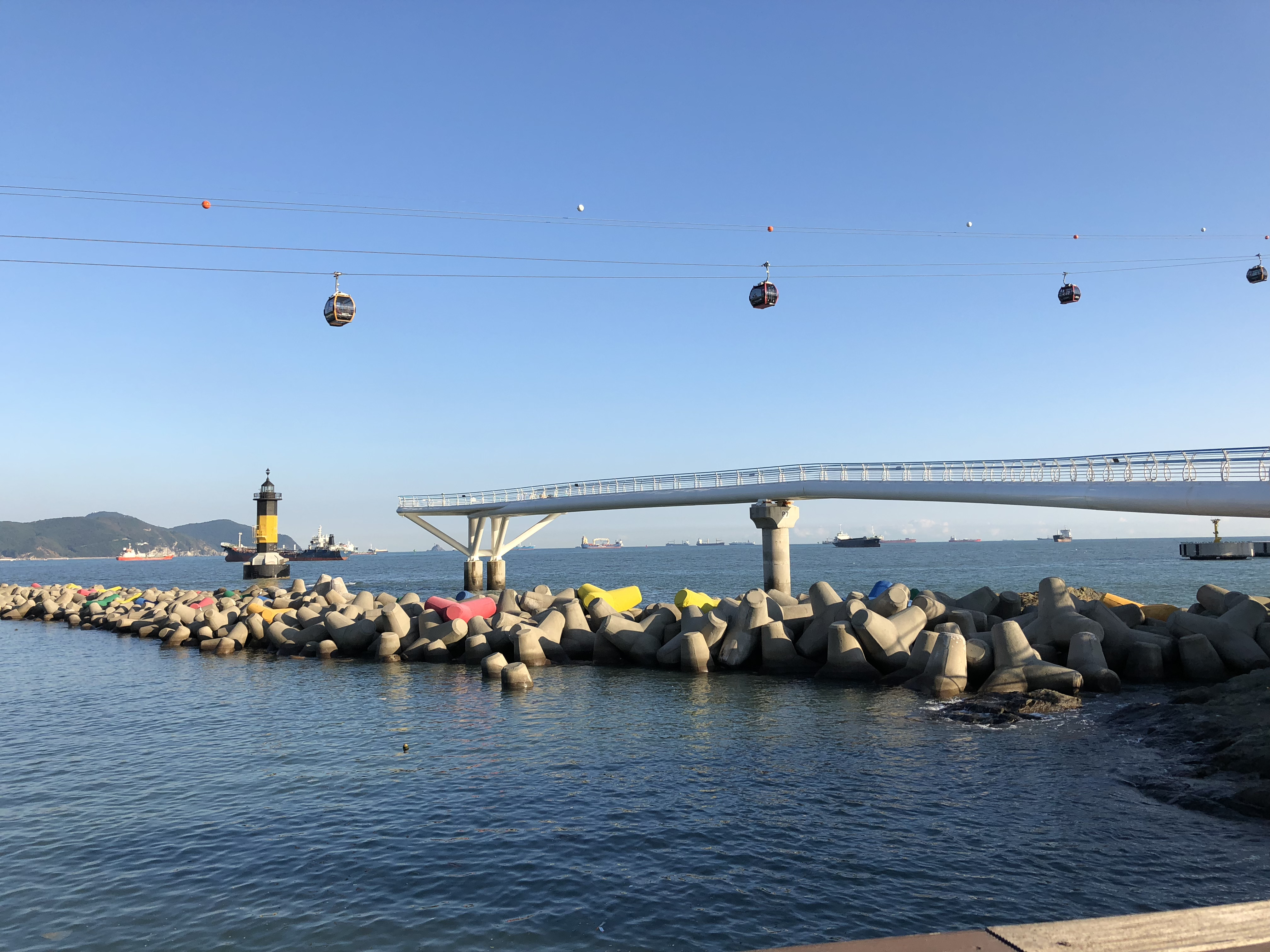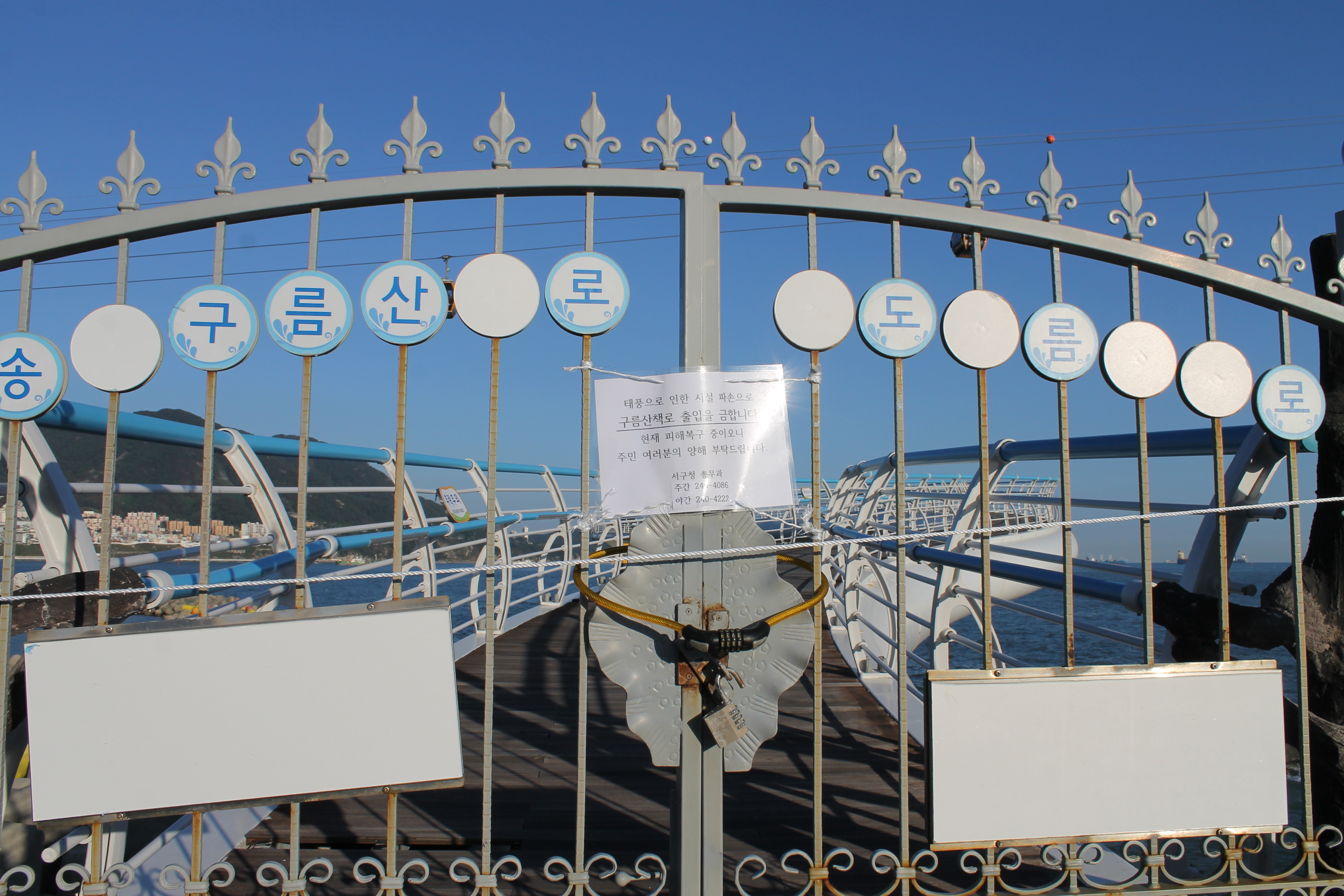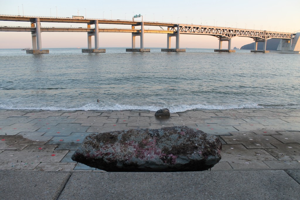 Our Busan tour proceeded with short stops at the Songdo Skywalk and Beach (unfortunately, the skywalk was closed due to the typhoon that hit Busan a few days prior) and Gwanghan Beach (where we saw some of the damage left from the typhoon, including some leaning sign posts and debris scattered around).