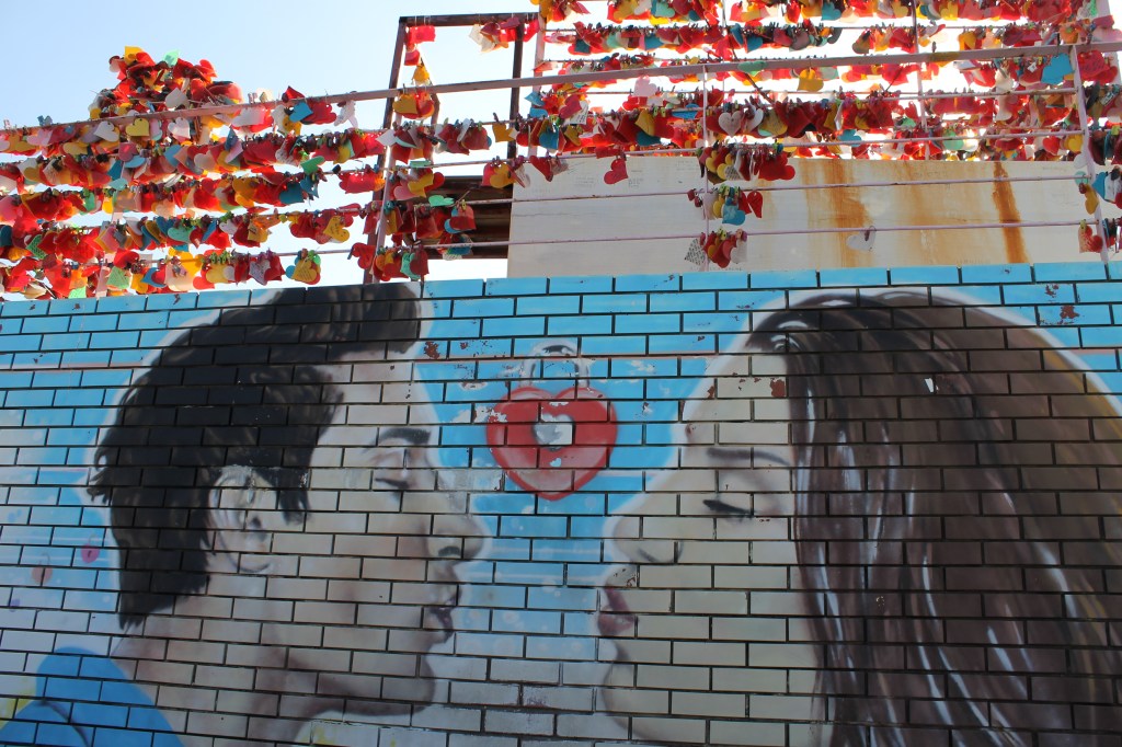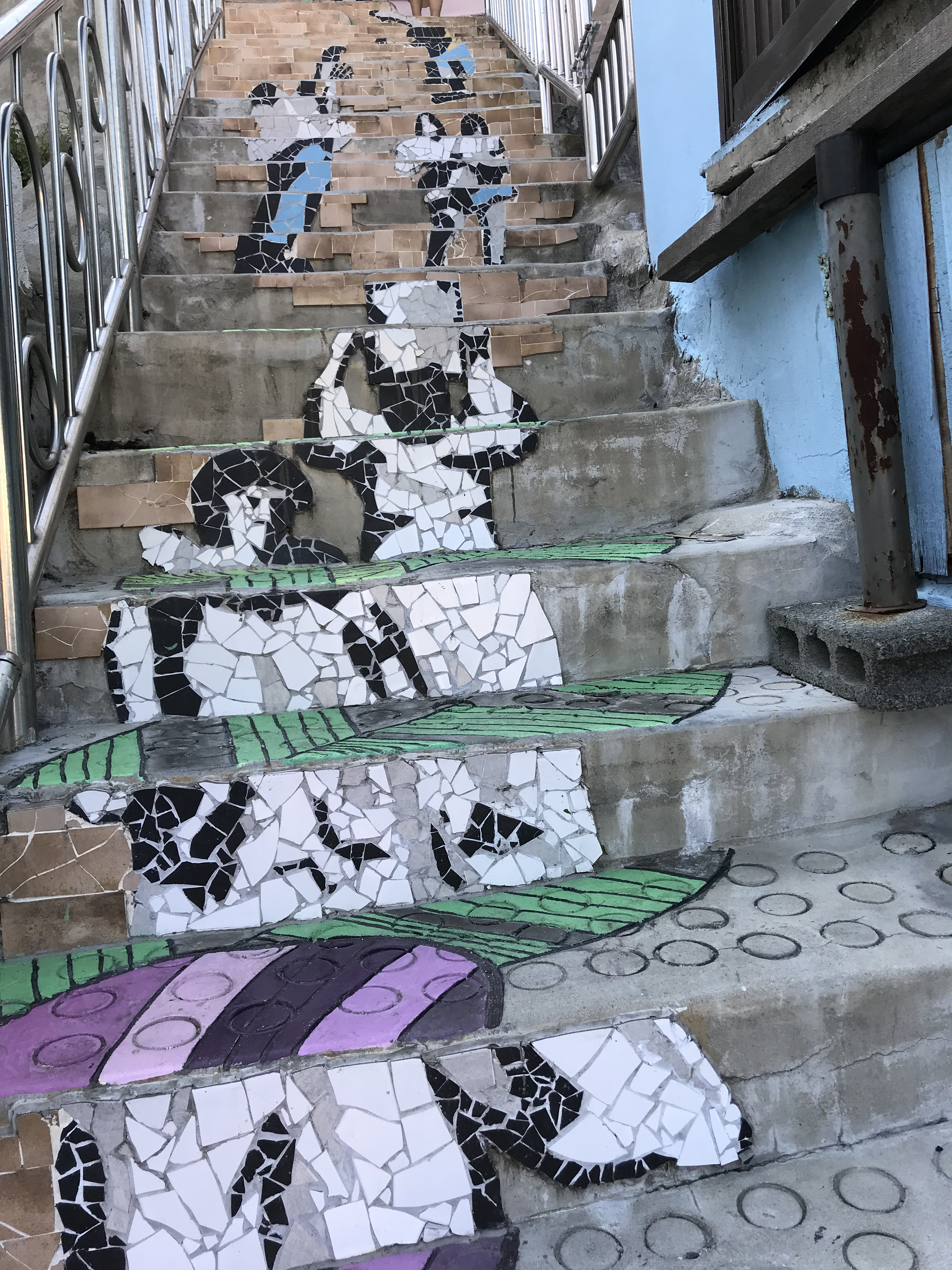 Walking down the winding pathway through the area, we passed by several cute shops (where I bought a new hairbrush and headband for myself), eateries, giant colorful murals, and painted staircases.